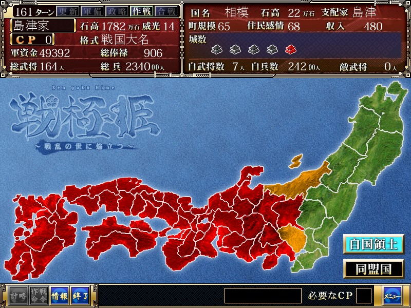 天下統一する前に北陸及び北関東を制圧しているあたりでクリア条件を満たしてしまいエンディング。