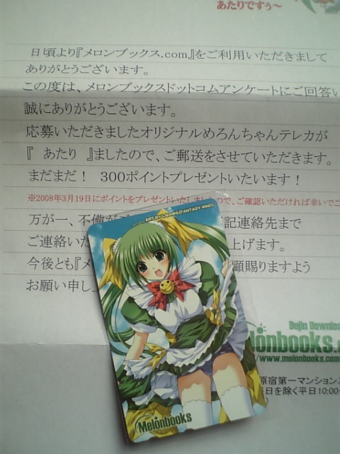 メロンブックスでアンケートに答えた際の景品みたいです。当選者は確かテレカ一枚に附き数名しかいなかったと思うんですが、こういうのって本当に当たるんですね。