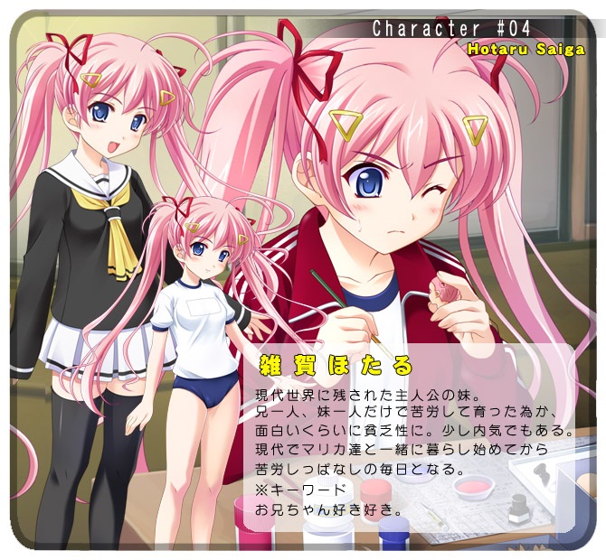 私自身は特に妹に期待していたわけではない(というかそもそもねこねこに面白い作品を期待していない)のですが、オムニバスタイプを除く複数主人公物の作品が大嫌いなので妹は別の主人公に攻略されますと明記して欲しかったというのが本音。まあ、書いてあったら買わなかったのである意味ねこねこソフトのやり方は正しかったのかもしれませんが。